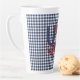 Colourful Americana latte mug features USA in red and blue decorated folk art style letters with red and blue floral bouquet on navy gingham chequered background. Perfect for 4th of July décor