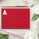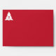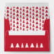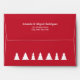 Custom red holiday card envelope features a geometric white Christmas tree with a custom monogram inside it on the top left of the front. The back flap has a customisable printed return address. On the back there is also a row of 7 white trees which goes across the bottom. Add your monogram initial, name and address in the sidebar. A modern geometric pattern of red Christmas trees on white is printed inside the envelope.