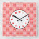 Small red dots on a white field are featured on this wall clock. The centre is solid white outlined in black with red numbers to mark the hours.