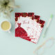 A feminine and elegant birthday thank you note. A white background, with red faux glitter, sparkles, red roses and a red dress. On front a large hand lettered script and the text: Thank You.