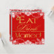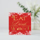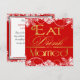 Red White & Gold Snowflake Wedding Invitations---match the RSVP cards and more found at the bottom of this page. Each invitation features an elegant snowflake print over top of a red shaded background. Invites also feature elegant and stylish lettering that reads, "Eat Drink and be Married." These wedding invitations are set to high quality basic card stock; however, you can change the stock to linen, felt (embossed), recycled, and several metallic shades if you would like under number 2 (choose your style, size & paper type) below the orange add to cart button. A list of the additional costs for a fancier card stock are displayed also under that option. Each invitation comes with a fitted white envelope.