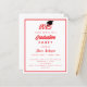 A modern and stylish invitation for a graduation party. For both him and her. White background, red text and a frame. A black graduation cap.