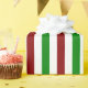 This wrapping paper design features Christmas inspired stripes coloured green, white, and red. Wrapping paper like this might be fun to use when preparing gifts or presents being given in celebration of a birthday, a wedding, an anniversary, or some other event.