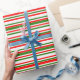 This Christmas-inspired design features a pattern of stripes having colours like red, white, and green. It might be fun to use wrapping paper like this when wrapping presents being given to celebrate a birthday, a wedding, an anniversary, or some other event.