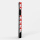 Personalised iPhone 5 case designed with a red and white houndstooth pattern and custom printed with your name or text in white over a diagonal black stripe.