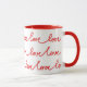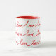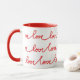 Red and White Modern Valentine themed Typography coffee mug featuring red text "love" against a white background,