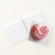 A square notebook decorated with a red and white marble heart.