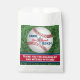 These red, navy blue, and white baseball Bar Mitzvah favour bags are a great way to send your guests off with a little treat from your baseball-themed Bar Mitzvah. These baseball Bar Mitzvah favour bags have a green grass background with a red and white baseball image, and a red, white, and navy band below the baseball that has a personalised message on it that says, "Thank you for sharing my Bar Mitzvah with me!" on it, along with the name and date of the Bar Mitzvah in navy blue in a sports-style accent font on either side of the light blue Star of David on the baseball which has fancy red and white Bar Mitzvah text overlaid on the centre of the baseball. Both the Star of David and the Bar Mitzvah wording can be removed if you want to use these for another type of baseball event.
