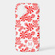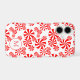 A custom monogram phone case with a red letter in a white circle hidden among a background pattern of swirly peppermint candies.