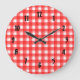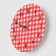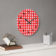 A wall clock with black handwritten-style numbers and a retro country red and white plaid pattern with overlapping thick and thin stripes. The numbers can be removed for a plain clock. Click Customise It to change elements, background colours and more.