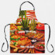 The apron features a bold vector illustration bursting with colour and detail. The background shows an American flag waving proudly alongside festive red, white, and blue decorations. A lush green yard is dotted with classic Mexican accents like terra cotta pots and prickly cacti.