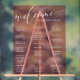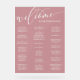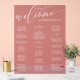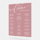 Acrylic seating chart printed transparent red with welcome in a swirly script and the seating chart in an elegant font. Works for any event. Seating chart sign printed on acrylic with a red-tinted background and white text. Welcome is printed at the top and you can add three columns of guests, sorted alphabetically so they can easily find to which table they're assigned. Red-tinted acrylic seating chart sign for any event with white fonts.