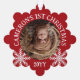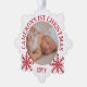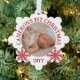 Snowflake shaped photo ornament with a round photo of your baby with curved text and pretty snowflakes in red and white.