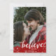 Stylish and uplifting, these holiday photo cards are a GREAT way to send some love and cheer this Christmas season. Features white stars and bokeh snow around a photo template with white script text "believe" over a red watercolor painted splash on the front. Additional white text is customisable. The back features a solid red background with the same stars and bokeh as the front. Happy Holiday and Merry Christmas!