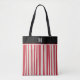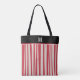 Here's a stunning red, and white irregular stripe pattern that makes a great looking tote bag! A wide top border of black holds your simple one letter monogram in white. The black border is separated from the stripe section by thin red and white lines. Both sides of the bag have the same design. Bold and unique, with a personalised touch!