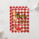 A classic red and white gingham is the background for this lively summer party invitation featuring highlighted text in black and yellow with a burger and watermelon to whet your guests' appetite. Fully customisable party invitation.