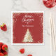 A red background and white text. Decorated with a snowcovered pine tree with golden faux glitter as snow. Merry Christmas is written with an elegant hand-lettered style script. Personalize and add your family name