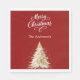 A red background and white text. Decorated with a snowcovered pine tree. Merry Christmas is written with an elegant hand-lettered style script. Personalize and add your family name