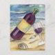 A bottle of red wine tilts against a half full wine glass on the beach. A platter of cheese is ready to be cut, as well as, a second wine is ready to be filled. Seashells are intermingled on the sand beach. Soft pastel coloured ocean waves are splashing in the background. The wine label can be personalised for your own message on a bottle! Painting rendered in watercolor. Make special red wine beach party postcards with your own text and images using the "Customise It" option for personalised holidays and special life occasions wine art gifts!