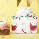 * A glass of wine with red and green ribbon, shiny silver stars in the back.