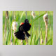 Red Wing Blackbird in full song, poised on marsh reeds in a classic pose. Great nature poster for bird watchers, can almost hear the song of the bird !