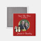 Cute custom Save the Date wedding Magnet, done with a red background, with a gold edged round photo field. A sweet country artwork penguin bride and groom decorate the bottom. Personalise this pretty magnet as a great way to announce your wedding plans.