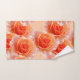 This bath towel set artwork showcases an elegant reddish-orange hued rose floral blending diagonal white pinstripes against a soft pinkish-orange background canvas.