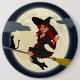 REDHEADED HALLOWEEN WITCH FLYING ON BROOMSTICK WITH CAT AND FULL MOON