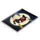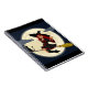 REDHEADED HALLOWEEN WITCH FLYING ON BROOMSTICK WITH CAT AND FULL MOON