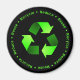 Black magnet with a green two toned recycling symbol surrounded by "Reduce - Reuse - Recycle" in repeating green text.
