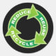 Green enviromental symbol, circle with arrows and the words reduce, reuse, recycle. Custom background colour.