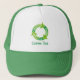Green enviromental symbol, circle with arrows and the words reduce, reuse, recycle. Custom text.