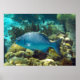 Swimming above soft corals, the scales of a blue reef fish pick up a few glints of the sun, as the light filters down from above the water's surface, while other smaller fish swim in the background.