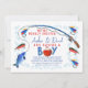 This boy's fishing themed baby shower invitation features a fishing rod, blue fish, some lure and bubbles as well as a fishing bobber that spells out boy.