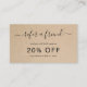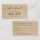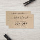 Simple business referral card featuring "refer a friend" with swashes in an elegant handwritten script font over a rustic brown paper background. The backside has the referral form and your contact information. This feminine design is great for a handmade craft business.