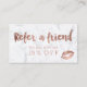 Refer a friend with this modern, stylish makeup referral card with modern hand lettering style brush typography in faux rose gold foil on a trendy and elegant white marble background with lips.
