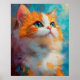 A charming digital painting of a Persian kitten with a luxurious orange and white coat, expressive green eyes, and a soft pastel background. This artwork blends realism with painterly abstraction, capturing the gentle elegance and adorable curiosity of the Persian breed.