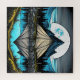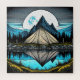 Ai art depicting a camping tent reflecting in the water of a lake with a pine tree and mountain background with the full moon shining down. Genereativecontent with a vintage vibe. Blue and tan colours.