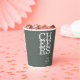 This modern wedding set has a warm, personal feel and many pieces feature an abstract, watercolor design resembling reflections on water. This coordinating paper cup has a solid color background of dark sage green, striking typography of 'Cheers' along with your names and wedding date. Search ID774 to see the complete set of matching products and additional color options for this design.