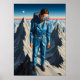 A stylised Art Deco oil painting depicting a woman in a cerulean blue hiking suit in a moment of contemplation on a mountain ridge, rendered with a polished, sculptural precision and dramatic overhead lighting from a high-angle perspective.