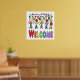 Refugees and Migrants Welcome design features stick people of many colors in friendly welcoming group - celebrating diversity, new arrivals and ensuring refugees and migrants are made welcome.