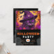 The top half of this invitation features a regal and enigmatic black cat, adorned with striking purple eyes and a matching purple witches hat. This feline companion exudes an air of mystery and grace. Delicate butterflies flutter around, and purple leaves add a touch of autumnal charm. It's a nod to the enchanting world of witchcraft and Halloween magic.