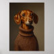 The artwork depicts a highly realistic, stylised portrait of a dachshund wearing a cosy, textured brown turtleneck sweater. The dog's expressive eyes and detailed fur are captured with an almost photographic quality, giving the piece a warm, intimate feel. The muted background complements the rich tones of the dachshund's coat and the sweater, highlighting the subject's dignified yet adorable appearance.