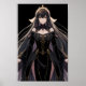 A majestic anime-style portrait of a powerful empress or queen. She possesses long, flowing dark hair with lighter streaks, piercing golden eyes, and a regal, serious expression. She is adorned with an elaborate golden crown featuring a prominent red gem, and wears a stunning black gown intricately detailed with gold trim and patterns, an off-shoulder design, and a high lace collar. White, veil-like elements frame her head, enhancing her commanding and elegant presence against a stark black background.
