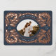 This photo save the date features intricate hand-drawn ornamental foliage that surrounds the text and photo.