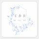 Elegant wedding stickers with a light blue shield crest adorned with watercolor blue leaves, with your monogram and wedding date in grey in the centre.