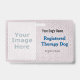 This highly visible badge easily clips to your clothing during a visit. It shows that your dog, with picture you add, is registered with the therapy dog organisation you specify. It explains that you are at a facility with permission and not claiming your dog as a service dog. It describes the services your dog provides. This product provides excellent visibility without interfering with petting or grooming the dog. It is less likely to be mistaken for a service dog misrepresentation as might a a vest, shabrack or jacket on the dog.