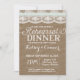 Rustic rehearsal dinner invitation, shabby chic lace and rustic burlap with an accent ribbon.