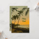 Rehearsal dinner invitations that are romantic and beach-y at the same time with a sunset photo taken at a palm tree coastline.