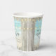 These rustic coastal wedding rehearsal dinner paper cups feature a scene of aqua blue ocean waves crashing against the beach, with a frame of weathered wood, and string lights accenting the top. Check out the collection for matching paper plates and napkins, and other table décor.